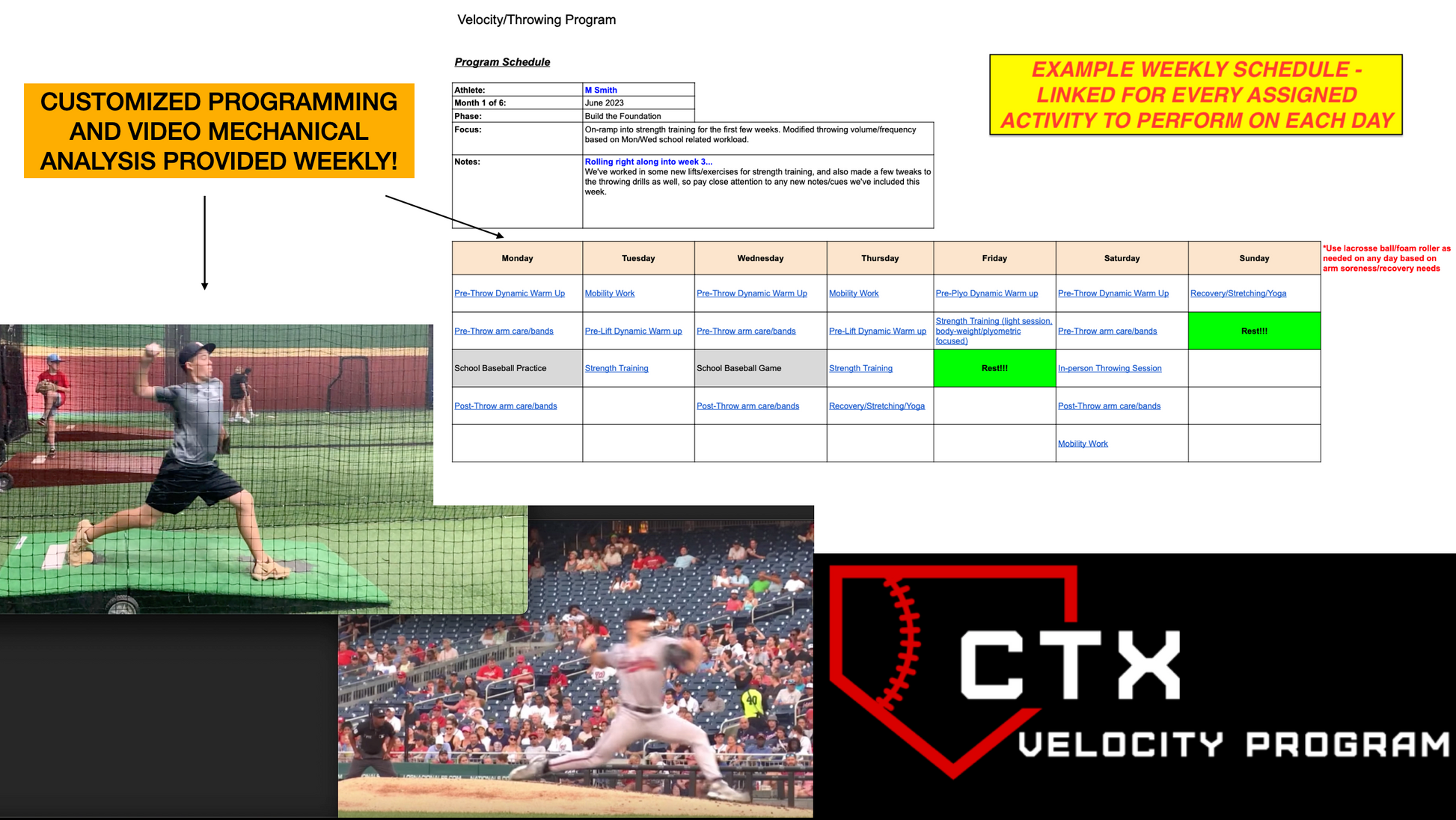 Limited spots available Introducing the Game-Changing Fully Customized Velocity Program for Baseball Pitchers! Are you a dedicated pitcher looking to unlock your full potential on the mound? Our Fully Customized Velocity Program is here to revolutionize your pitching game, helping you increase your throwing velocity and dominate the competition like never before.Customized Pitching and Velocity Program